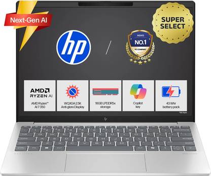 HP HP OmniBook 7 Aero (Previously Pavilion Aero) AMD Ryzen AI 7 Octa Core AI 7 350 - (16 GB/512 GB SSD/Windows 11 Home) 13-bg1456AU Thin and Light Laptop (13.3 Inch, Glacier Silver, 1.0 Kg, With MS Office)